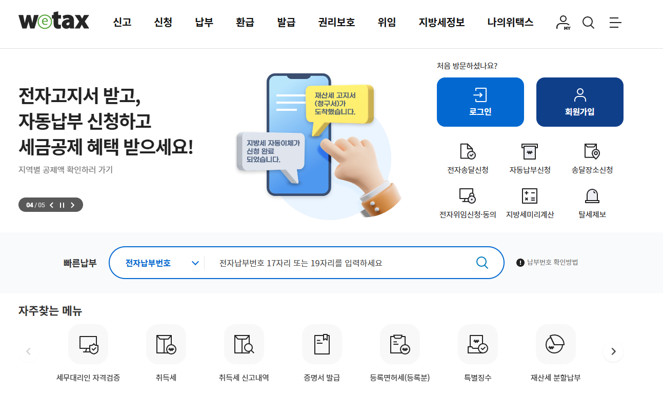 - 위택스(WETAX): 위택스 홈페이지에 접속하여 회원가입 후 로그인합니다. 이후 자동차세 메뉴에서 납부할 수 있습니다.
