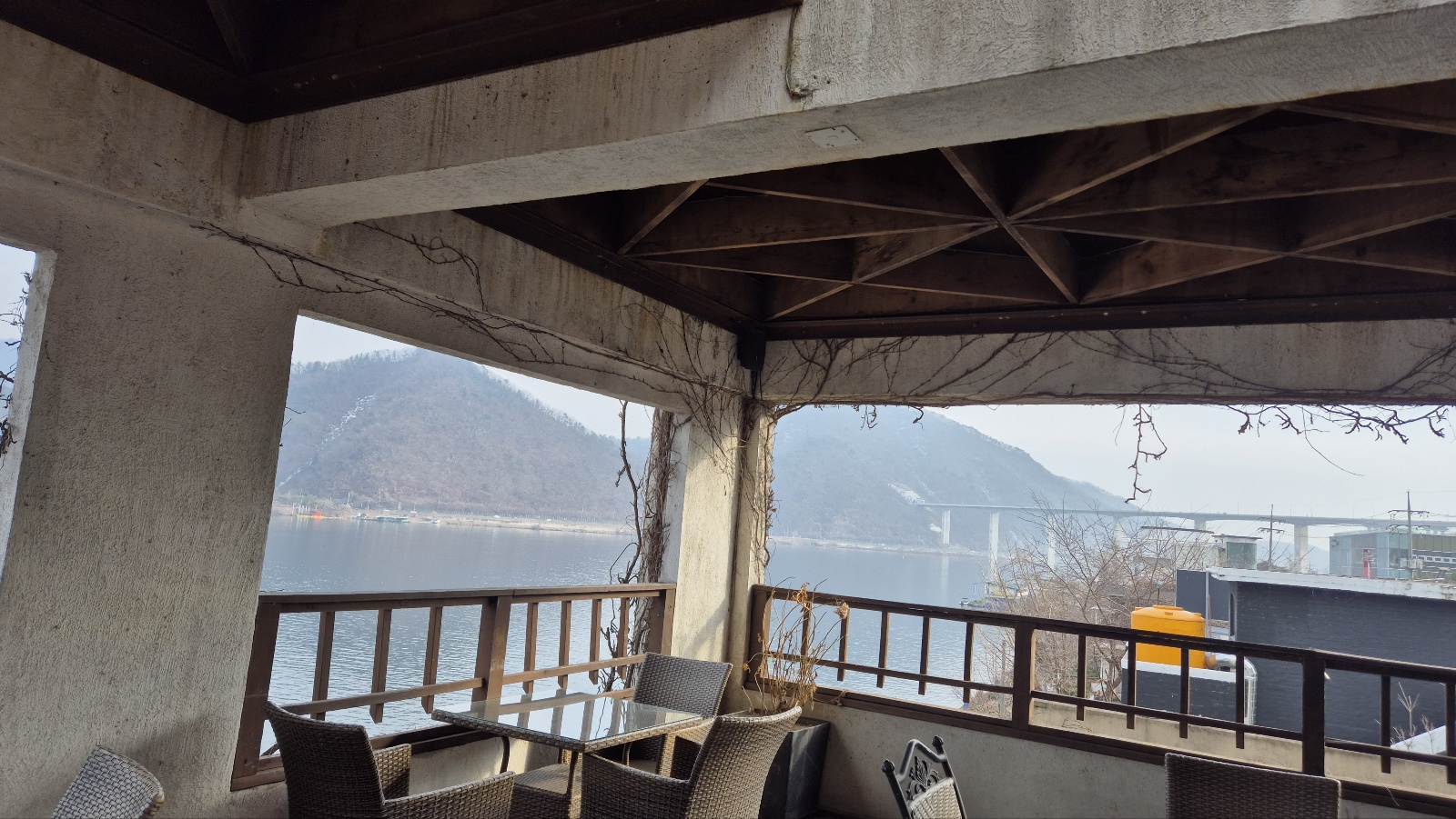 특히 통유리창을 통해 들어오는 자연 채광이 카페의 분위기를 한층 더 높여주는데요. 계절마다 다른 풍경을 감상할 수 있어 사계절 내내 방문객들의 발길이 끊이지 않아요. 한겨울이라 건물외관의 풍경은 그닥 좋진않았지만 건물에서의 뷰는 탁트인 북한강이 보여 좋았습니다.