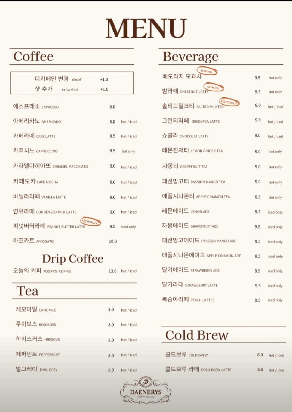 대너리스카페의 메뉴는 어떤 것들이 있을까요? 가장 인기 있는 메뉴는 수제 티라미수와 아인슈페너예요. 부드러운 마스카포네 치즈의 풍미와 깊은 에스프레소의 조화가 일품이에요.