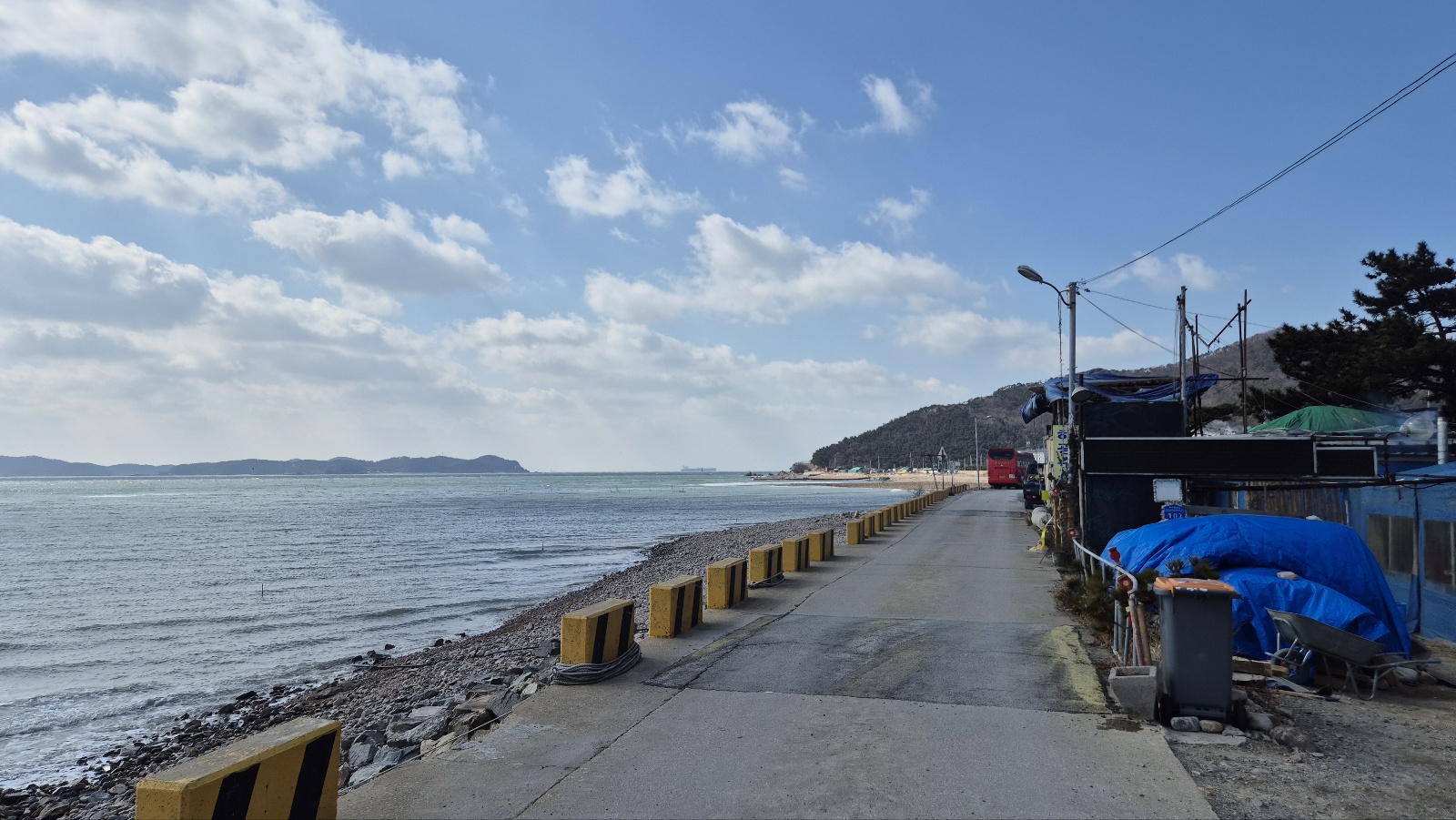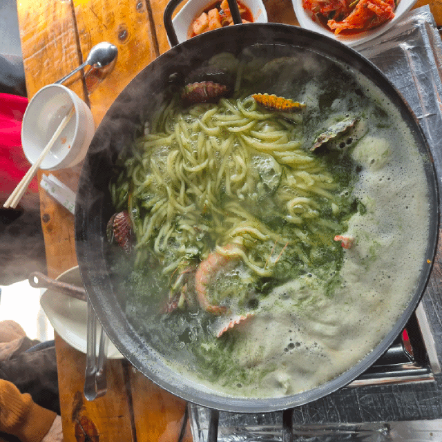 칼국수 면은 쫄깃하게 반죽해 직접 손으로 썰어 만든다고 해요. 이 면이 매생이와 어우러지면서 특별한 식감을 만들어냅니다. 거기에 각종 해산물 고명이 푸짐하게 올라가 있어 한 그릇만으로도 든든해요. 바닷가 바로 앞이라 바닷가를 바라보며 식사가 가능하다는것도 참좋아요.